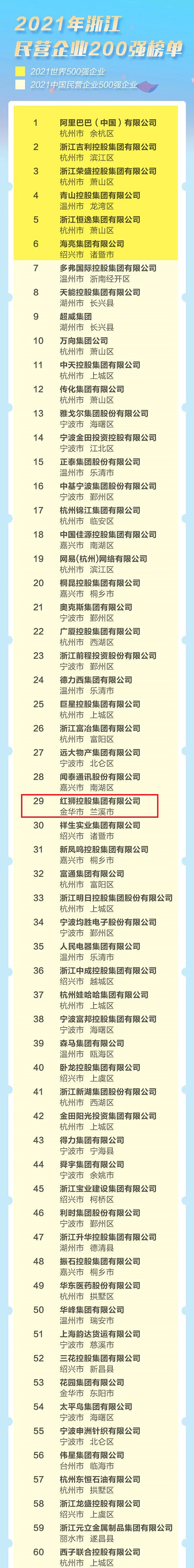 紅獅集團(tuán)列2021浙江民營企業(yè)200強(qiáng)第29位