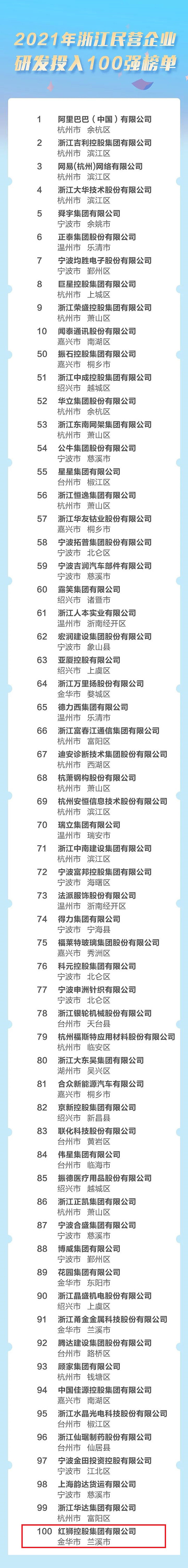 紅獅集團(tuán)分別列2021浙江民營企業(yè)200強(qiáng)第29位、研發(fā)投入100強(qiáng)第100位、就業(yè)100強(qiáng)第54位。