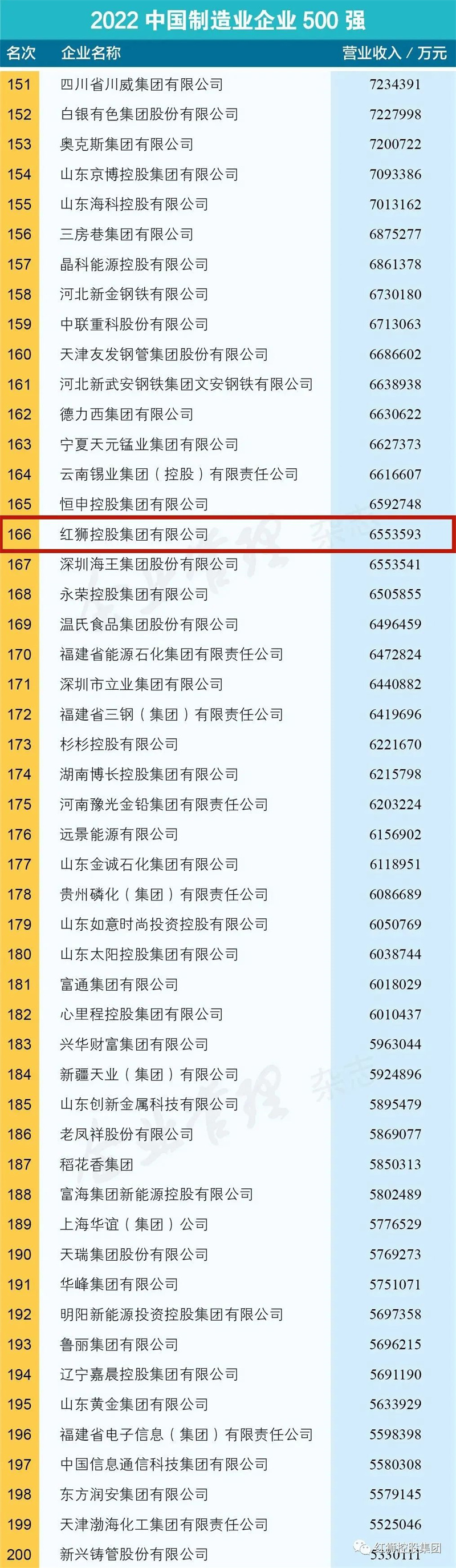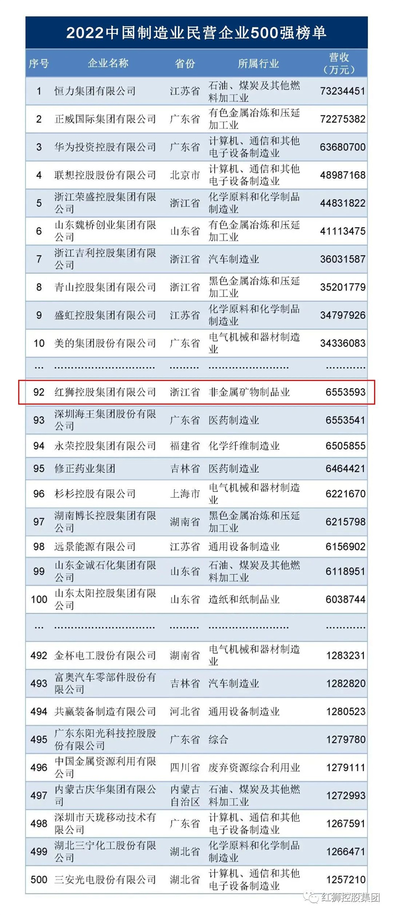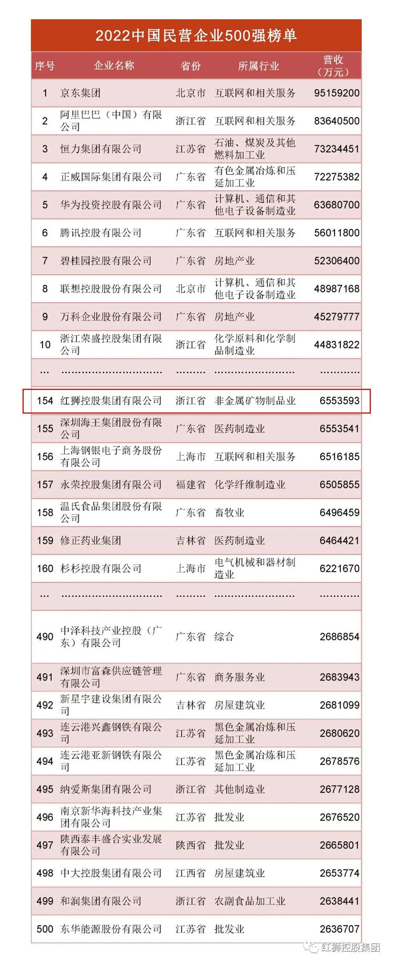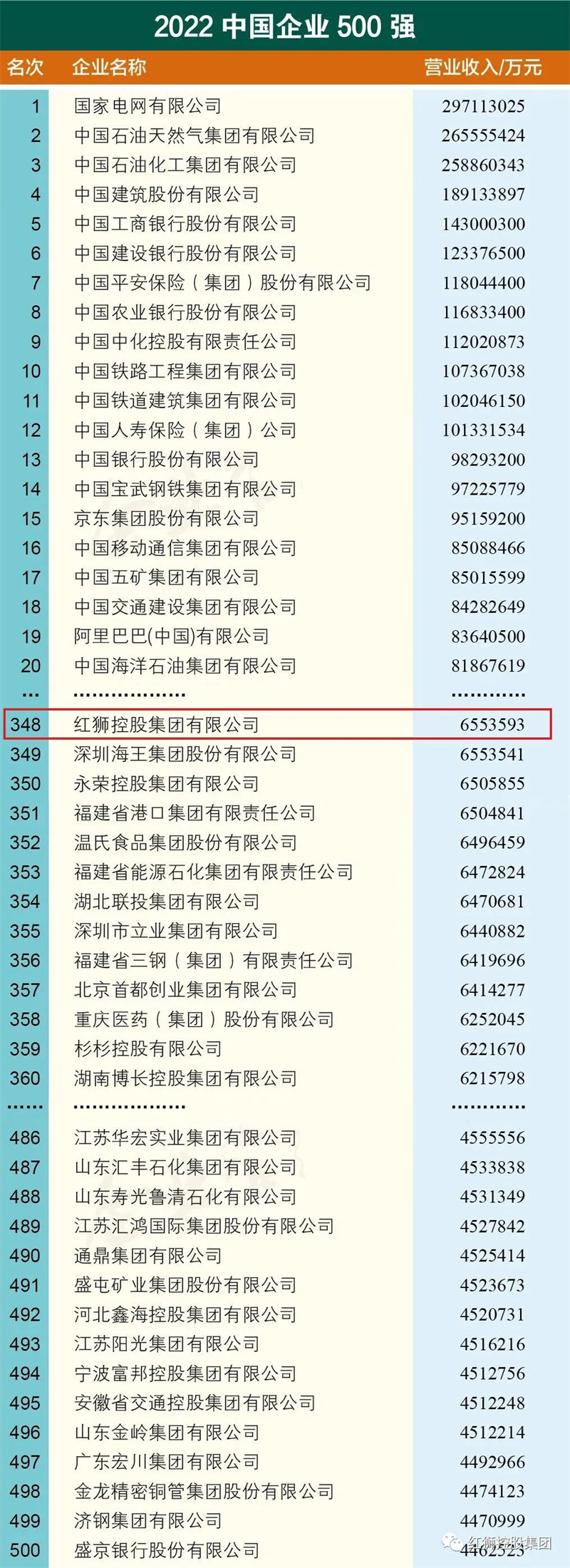 紅獅集團位列2022中國企業(yè)500強第348位、中國民營企業(yè)500強第154位