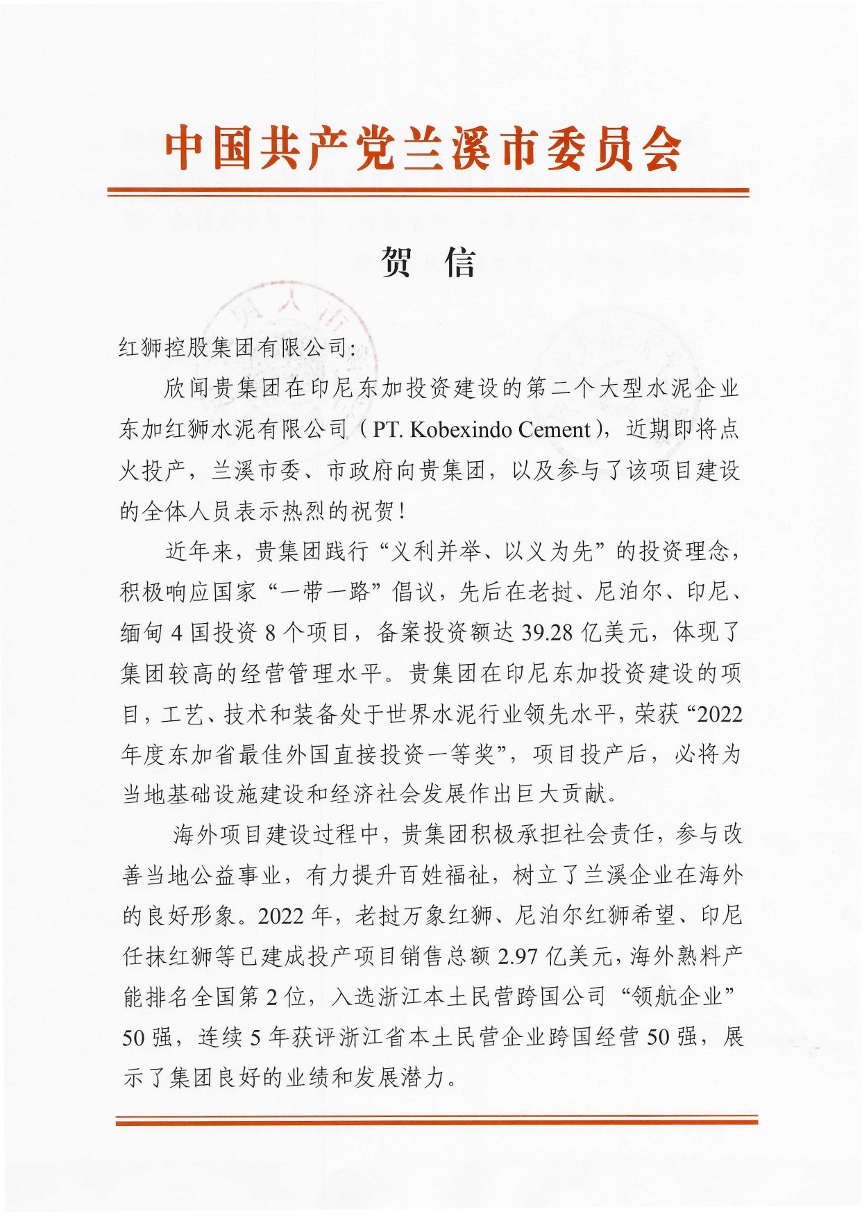 蘭溪市委市政府向紅獅集團印尼東加紅獅水泥項目點火投產發(fā)來賀信