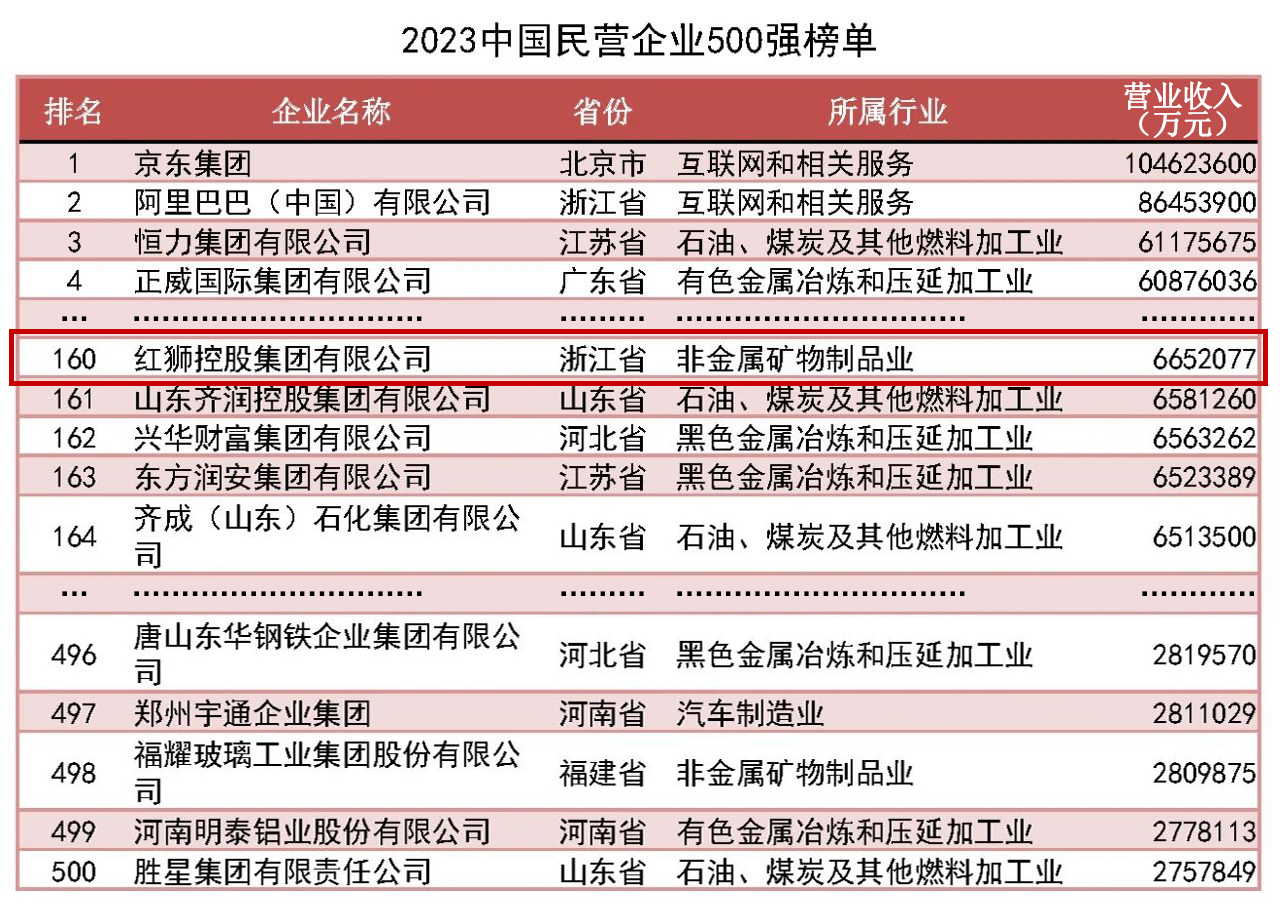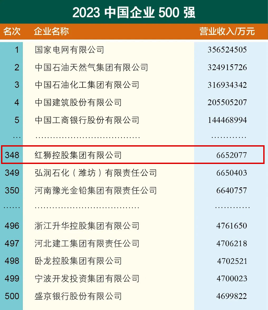 紅獅集團(tuán)位列2023中國企業(yè)500強(qiáng)第348位、中國民營企業(yè)500強(qiáng)第160位
