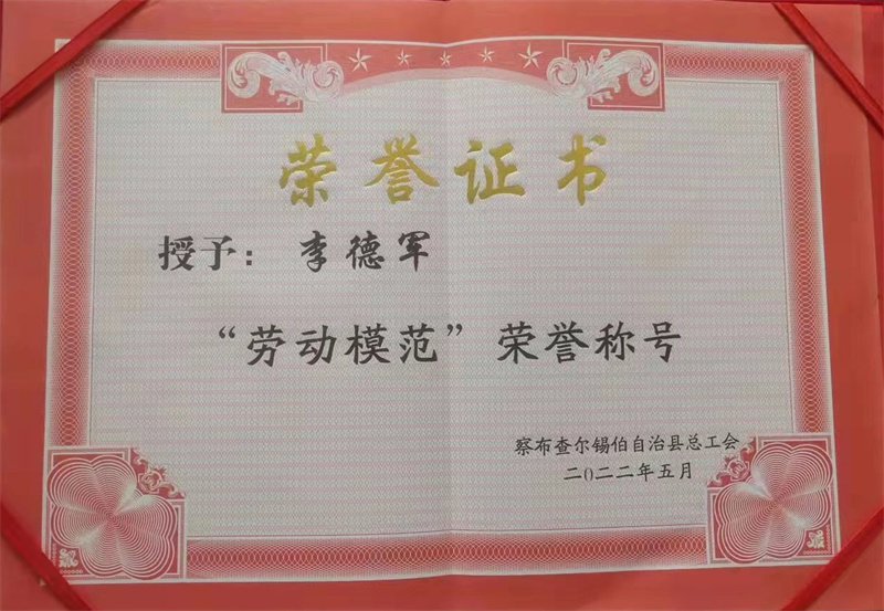 新疆金龍李德軍榮獲察布查爾縣總工會(huì)“勞動(dòng)模范” 榮譽(yù)稱(chēng)號(hào)