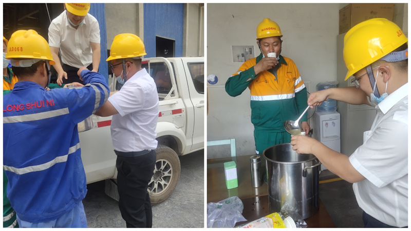 為做好高溫期間防暑降溫工作,積極為生產(chǎn)一線服務(wù),新疆金龍水泥有限公司決定自7月1日起由綜合科組織牽頭,各管理線部門配合,積極開展“為高溫崗位員工送清涼”活動。7月2日下午,管理線部門志愿者頂著35度的高溫,將“員工餐廳”提前精心準備好的綠豆湯,送至提前規(guī)劃好的點位,燒成辦公室、制成辦公室、安??崎T口等重點崗位,為那些堅守在第一線的員工們送上一片清涼,看著現(xiàn)場一線員工曬得通紅的臉龐,志愿者趕緊給他們送上了一杯綠豆湯,員工們臉上露出了開心的笑容,一邊喝著綠豆湯,一邊紛紛表示,一定會克服酷暑高溫,堅守崗位,努力完成公司交辦的工作任務(wù)。