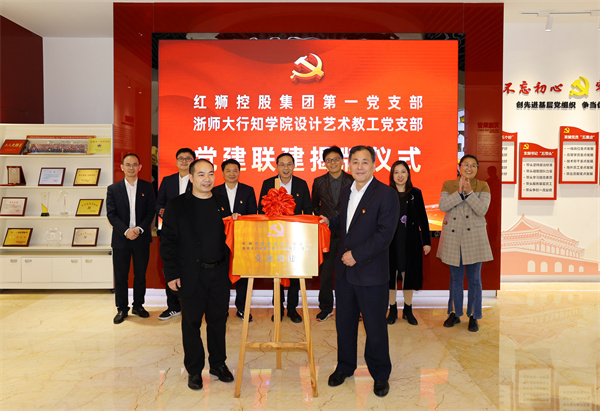 “二十大”精神宣講會前,集團(tuán)副總經(jīng)理楊志清、黨委副書記許如華陪同與會領(lǐng)導(dǎo)在大廳一樓觀看宣傳片、參觀集團(tuán)展廳、黨建展廳、控制中心、座談交流,紅獅集團(tuán)黨委第一支部書記許如華與行政學(xué)院設(shè)計藝術(shù)學(xué)院教工黨支部書記夏盛品共同為黨建聯(lián)建揭牌。