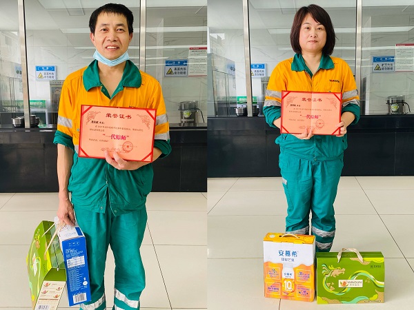 夠?qū)嵙?,才敢與“粽”不同。比賽原計(jì)劃時(shí)限為十分鐘,但經(jīng)過(guò)激烈的角逐,不到十分鐘就風(fēng)卷云殘,一粒米都不剩,桌面堆滿了風(fēng)格各異的粽子。由圍觀群眾共同組成“粽情組”將包好的粽子進(jìn)行收取,對(duì)粽子大小適中、均勻,四角不露餡、捆扎整齊、不松線、個(gè)數(shù)等進(jìn)行綜合評(píng)比,最終設(shè)備科連良超、財(cái)務(wù)科田秀珠包得又好又快又多,贏得圍觀群眾嘖嘖稱贊,毫無(wú)懸念分別榮獲了男組、女組的“一代粽師”稱號(hào),頒發(fā)榮譽(yù)證書一本、精美獎(jiǎng)品一份。獨(dú)樂(lè)樂(lè)不如“粽”樂(lè)樂(lè),公司也貼心地為其余參與比賽的粽師們準(zhǔn)備了禮物;大家收獲了獎(jiǎng)品,更收獲了快樂(lè)。